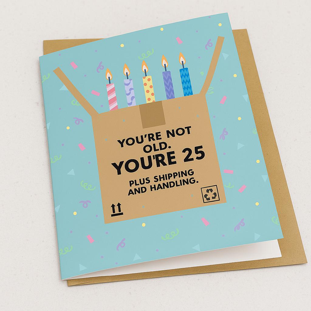 Age is just a number... a number plus shipping and handling! This hilarious birthday card is the perfect way to poke fun at a friend or loved one who's celebrating another trip around the sun. Featuring the witty phrase 'You're not old, you're 25 plus shipping and handling,' this card is guaranteed to bring a smile to their face (and maybe a slightly offended gasp!). It's ideal for anyone with a sense of humor and a love for clever puns. Forget the generic, boring cards – give the gift of laughter with this unique and memorable birthday greeting!