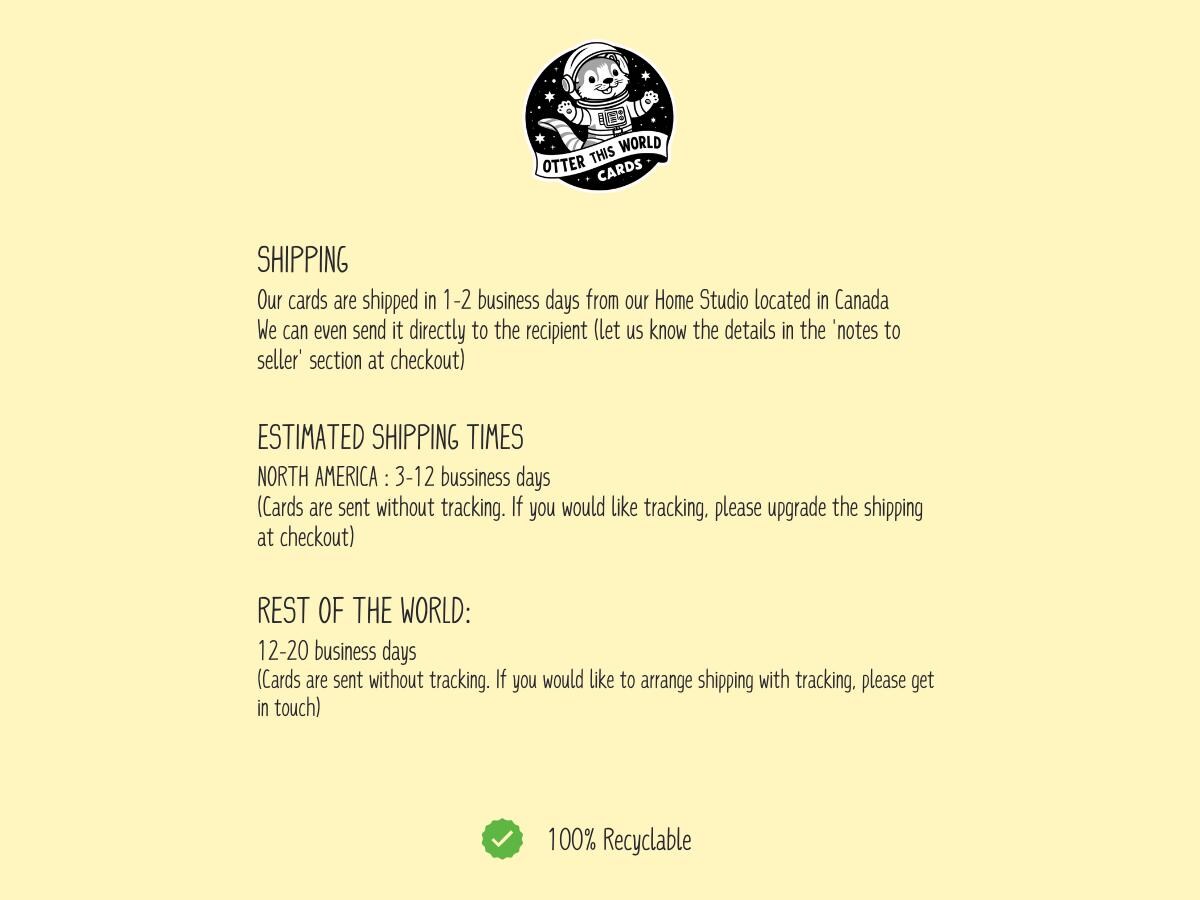 + NORTH AMERICA : 3-12 business days (Cards are sent without tracking. If you would like tracking, please upgrade the shipping at checkout).