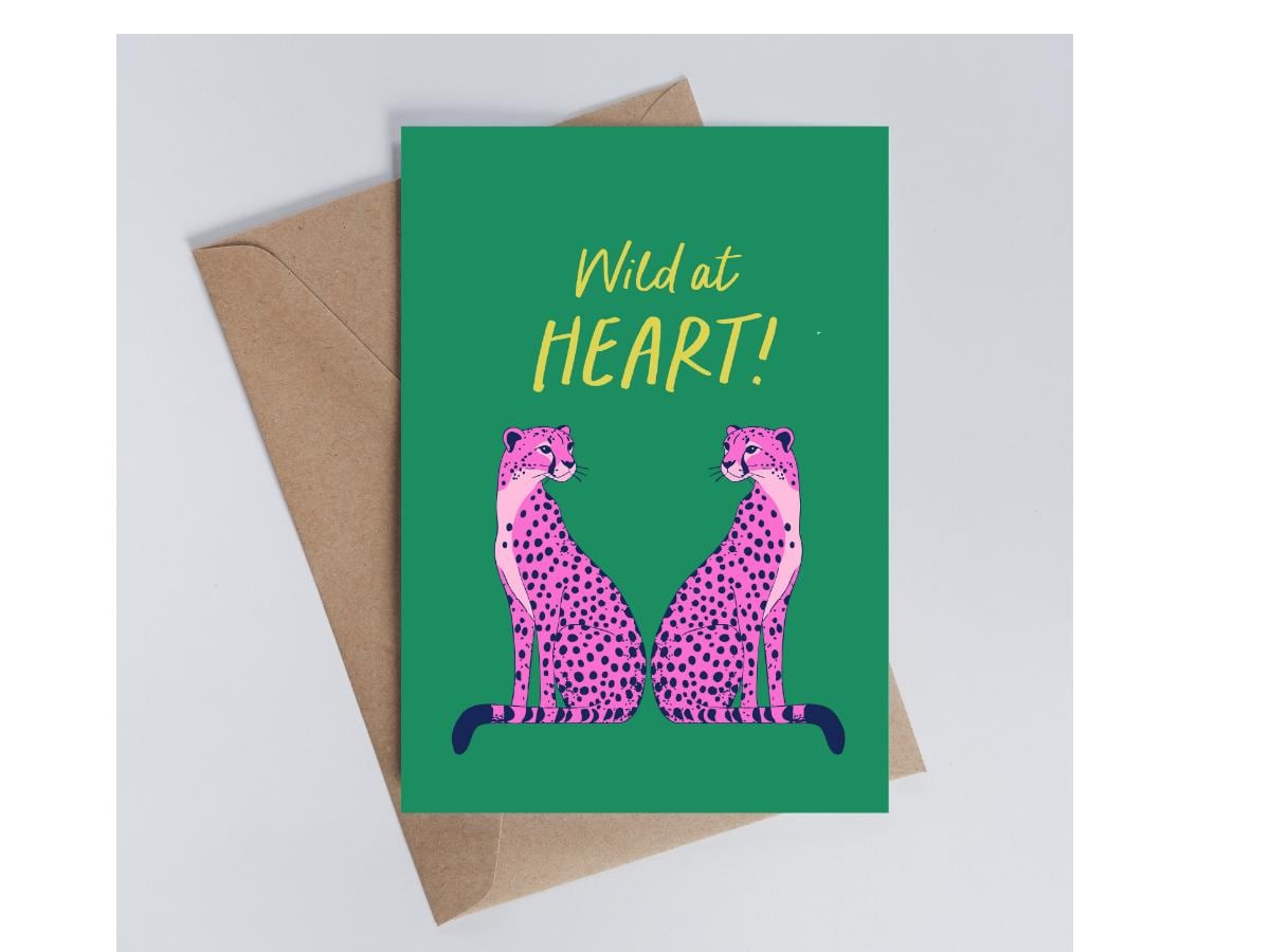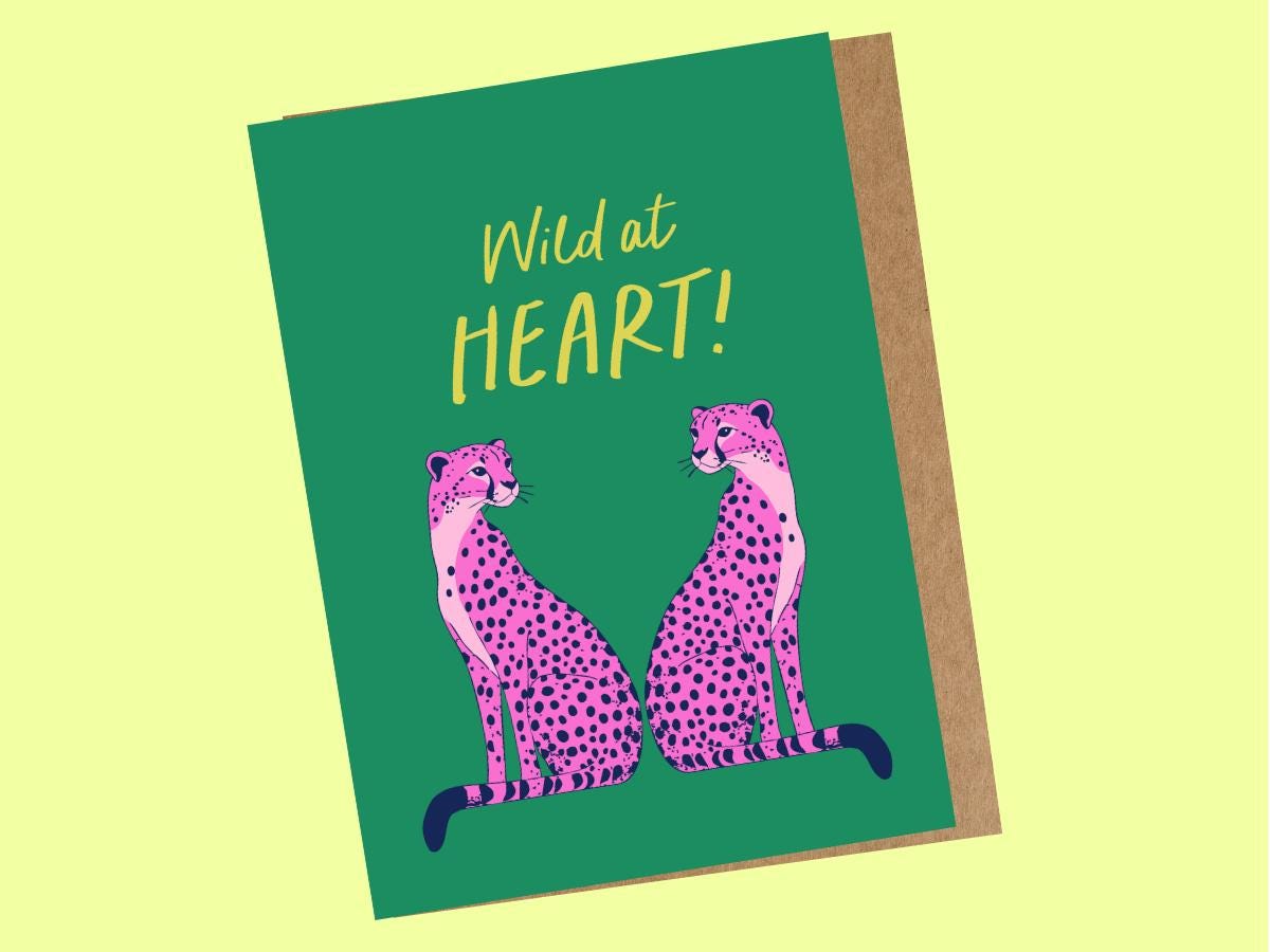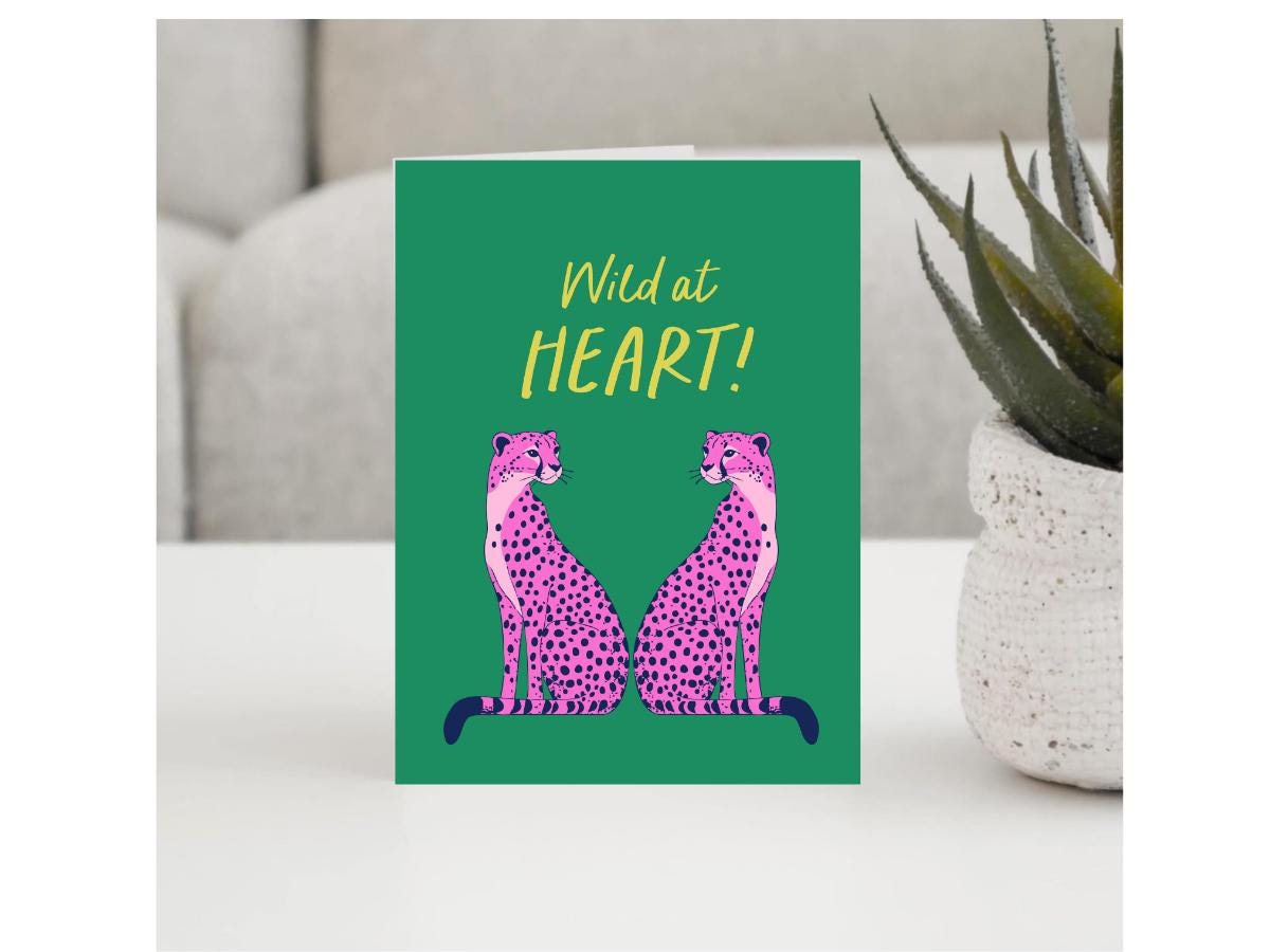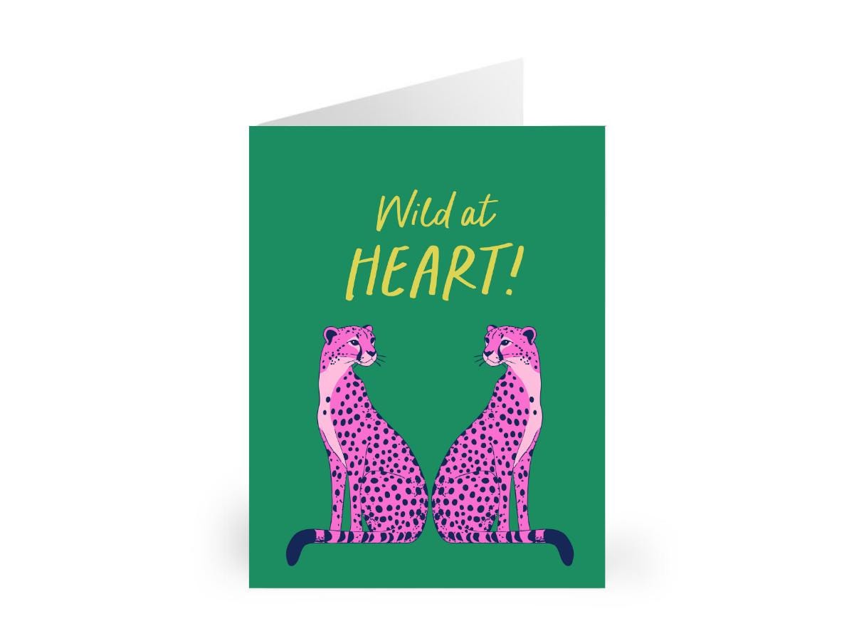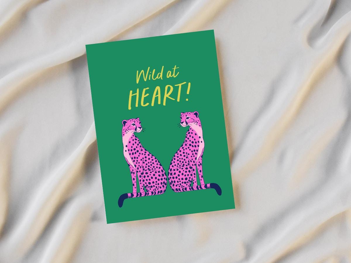 Celebrate the fierce and fabulous with this stunning "Wild at Heart" greeting card featuring two majestic pink cheetahs perched gracefully on a branch. This eye-catching design combines bold emerald green with vibrant hot pink for a truly unique greeting card
