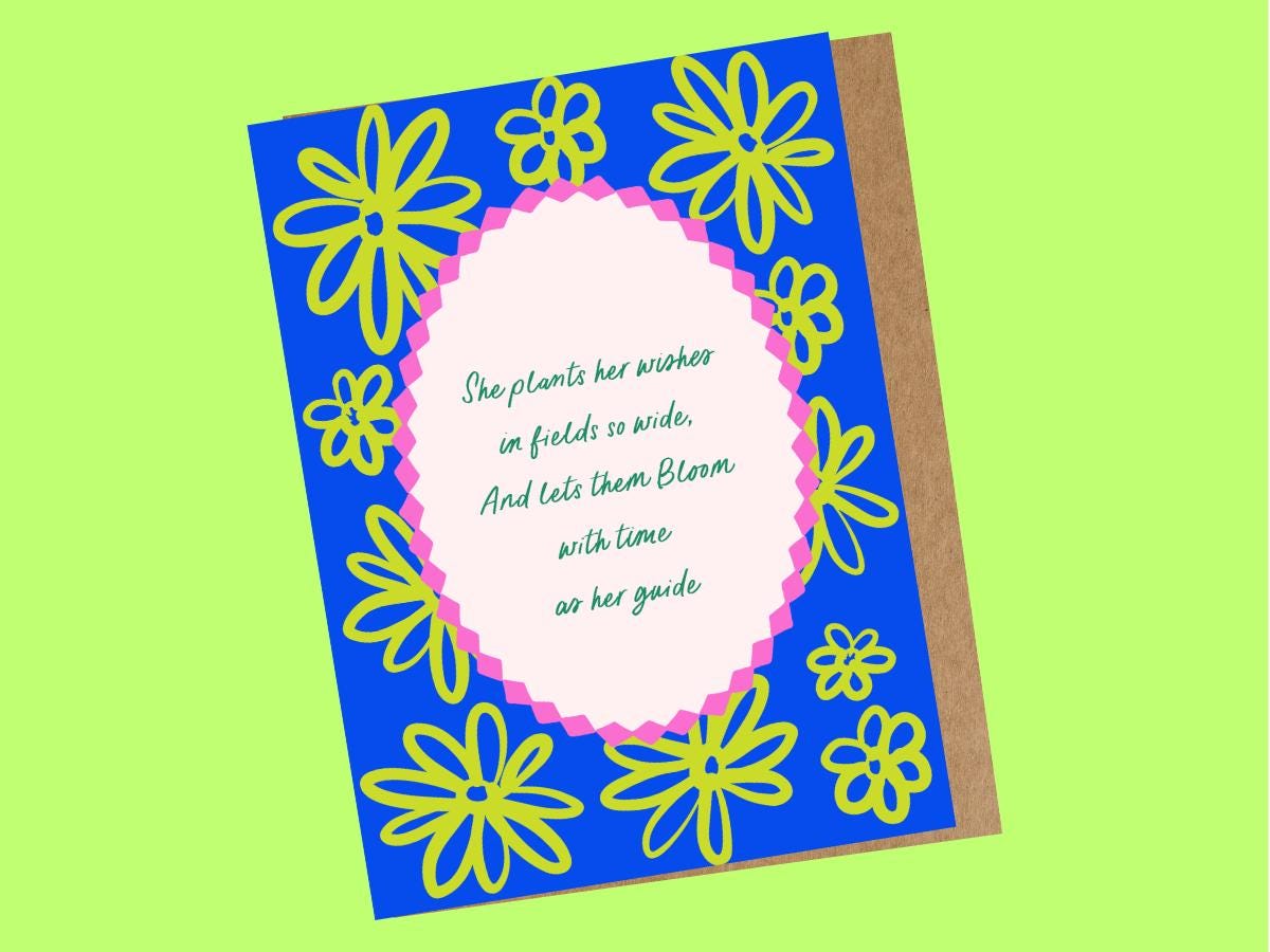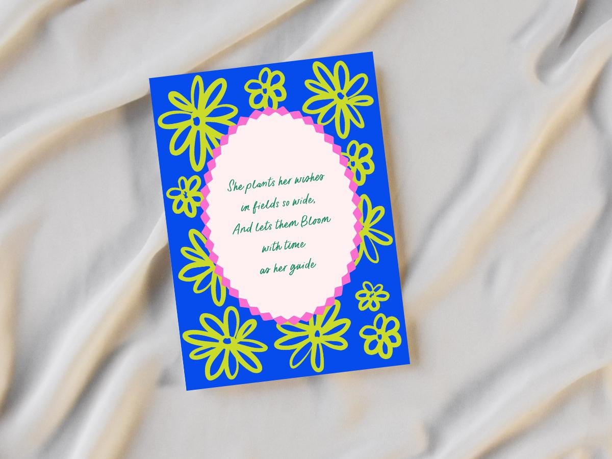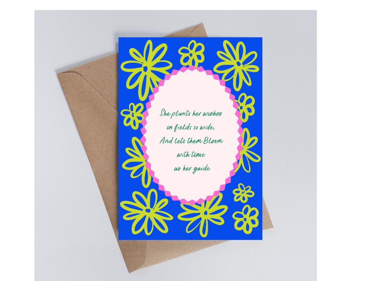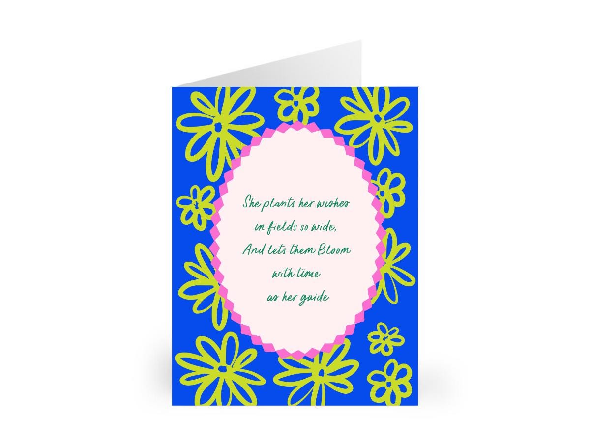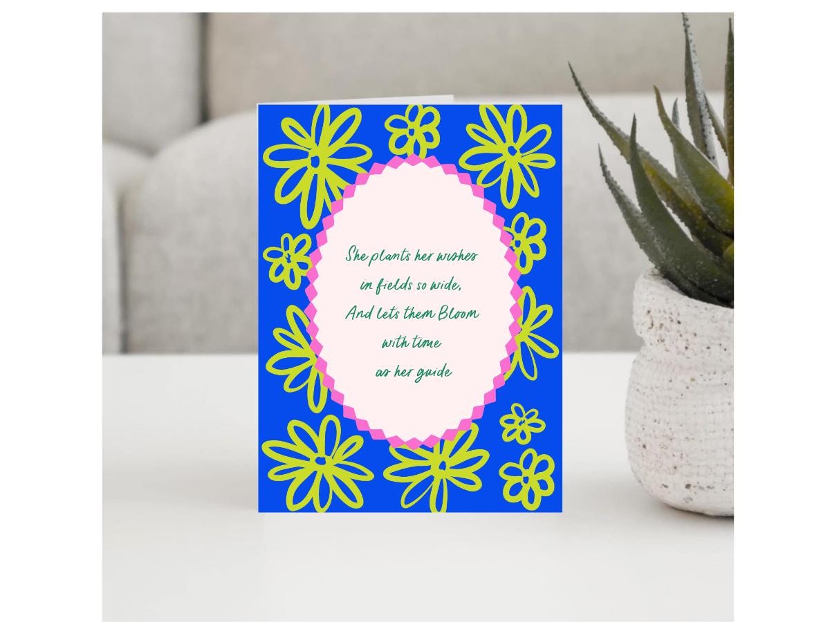 Send heartfelt encouragement with this vibrant floral greeting card featuring beautiful hand-drawn flowers on a bold blue background. The inspiring message celebrates growth, dreams, and guidance, making it perfect for graduations, new beginnings, or simply letting someone know you believe in them. This 5x7 card is printed on high-quality cardstock and comes with a kraft envelope.