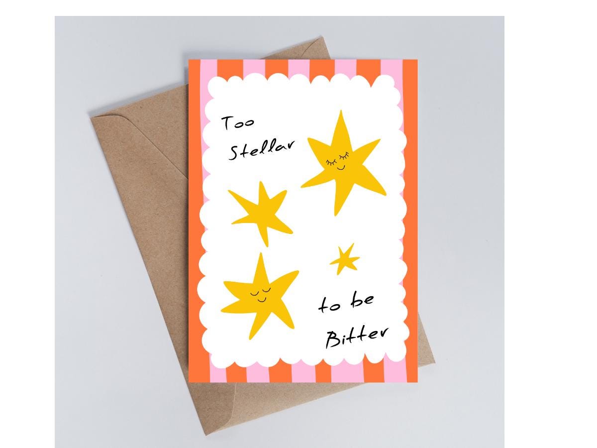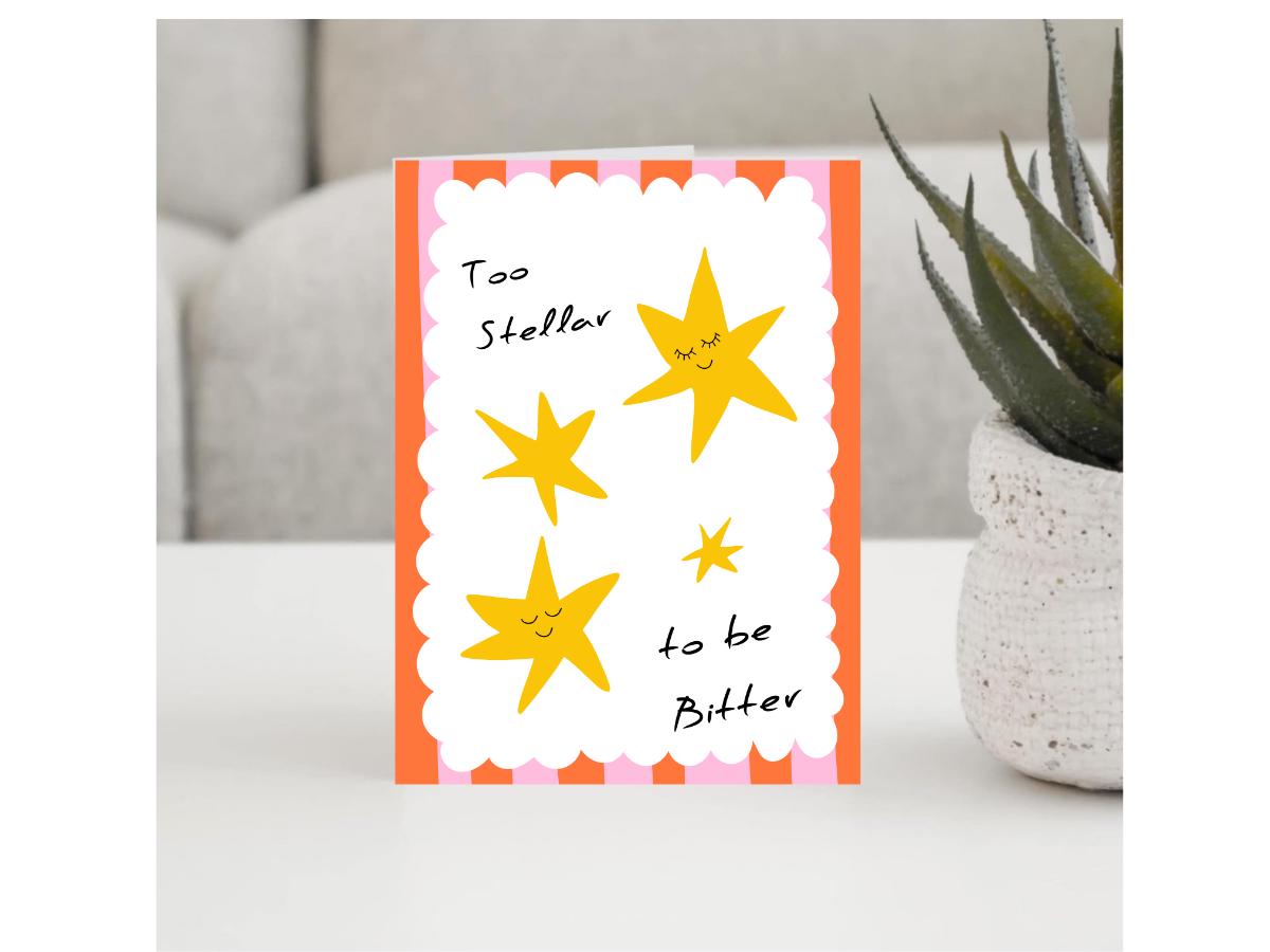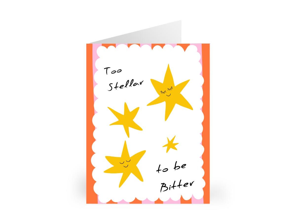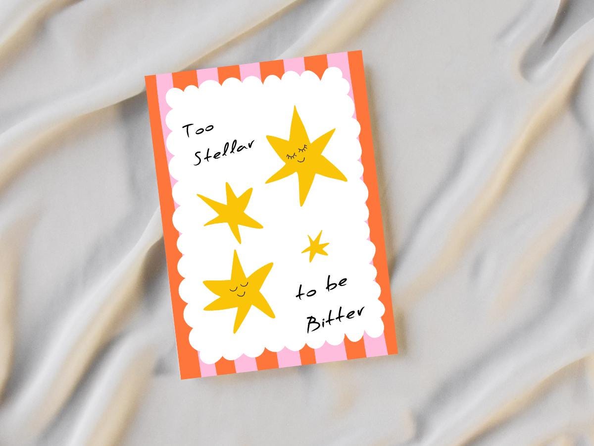 Brighten someone's day with this cheerful "Too Stellar to be Bitter" greeting card! Featuring adorable smiling stars on a vibrant pink and orange scalloped border, this uplifting card is perfect for sending encouragement, celebrating achievements, or just letting someone know they shine bright. The playful hand-lettered message and cute star illustrations make this card a delightful way to spread positivity.
