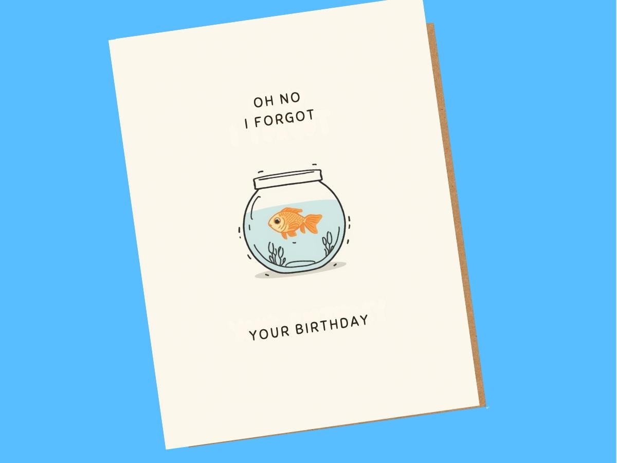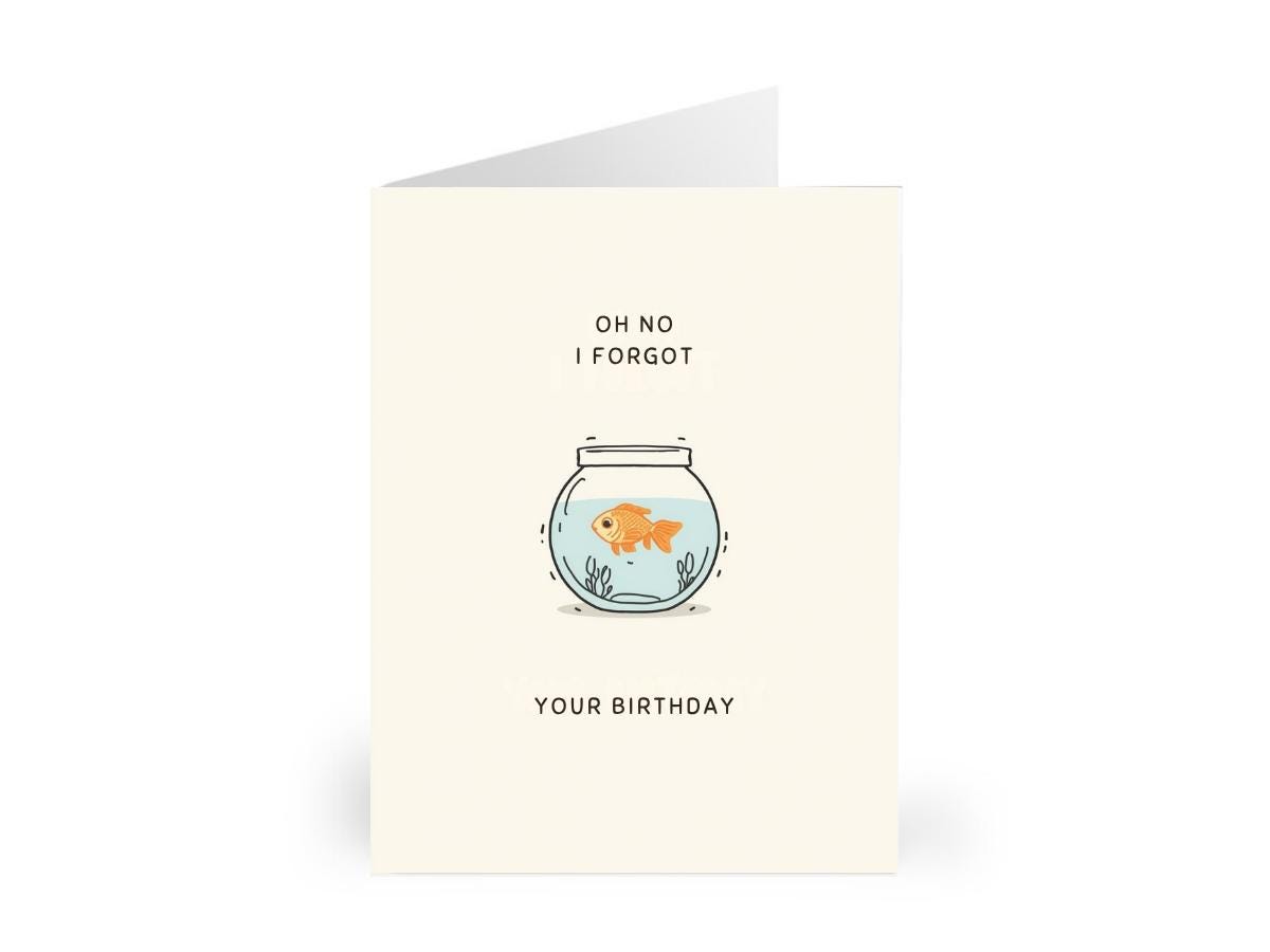 This funny belated birthday card is perfect for anyone who’s ever had a goldfish memory moment! Featuring a hand-drawn goldfish in a bowl with the words “Oh no I forgot your birthday,” this card adds humor and charm to any late birthday wish. Printed on premium cardstock with a minimalist design, it’s ideal for friends, coworkers, or family members who appreciate a good laugh. Comes with a kraft envelope and blank inside for a personal message.