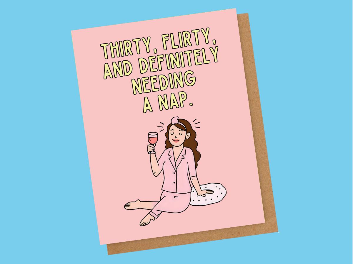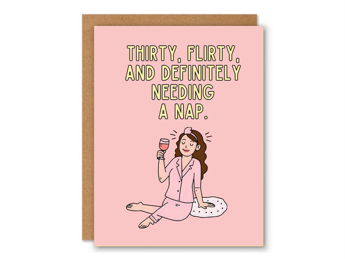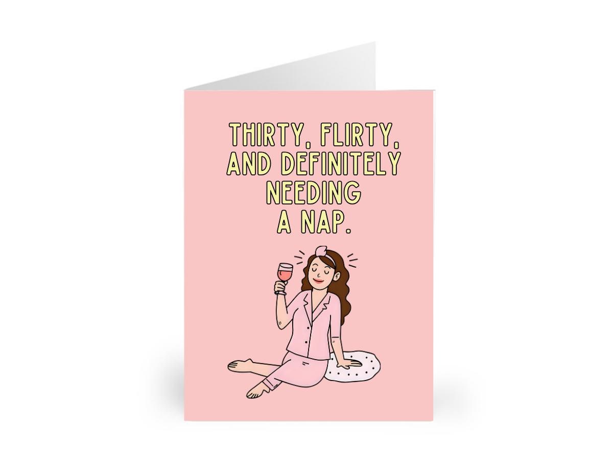 This funny 30th birthday card reads “Thirty, Flirty, and Definitely Needing a Nap” — featuring a hand-drawn cartoon woman in pajamas holding a wine glass and yawning. Perfect for your sleep-loving, wine-sipping bestie who’s embracing her thirties with style and sarcasm.