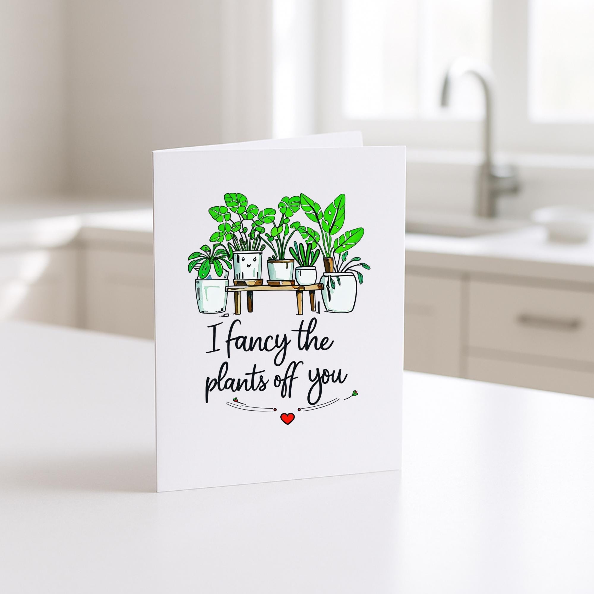 Bring a smile to someone special with this charming 5x7 greeting card featuring a playful plant-themed pun: “I fancy the plants off you.”