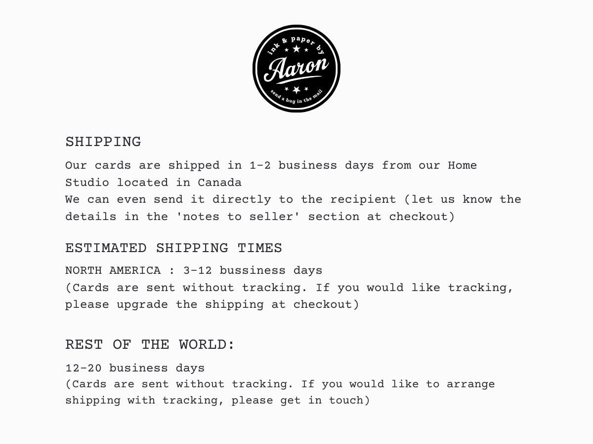+ NORTH AMERICA : 3-12 business days (Cards are sent without tracking. If you would like tracking, please upgrade the shipping at checkout).