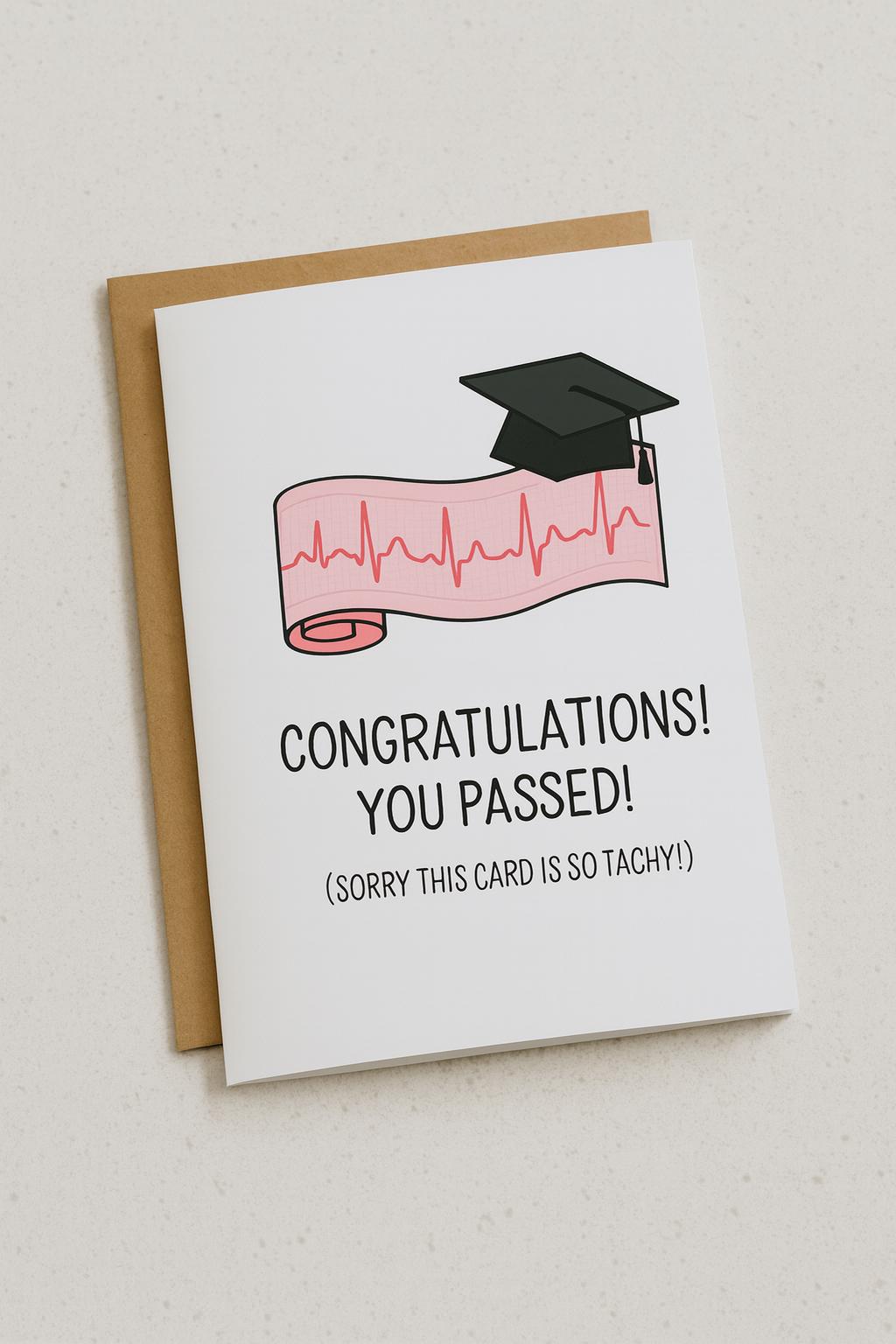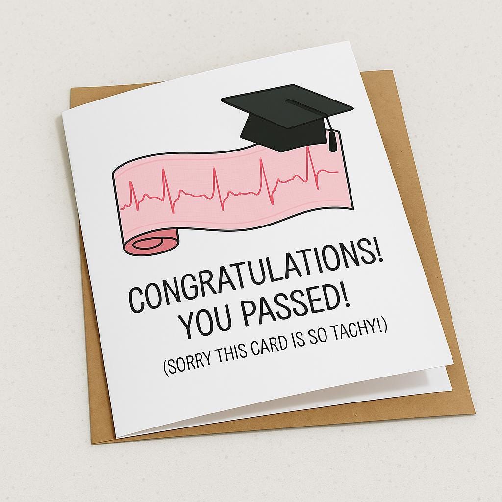 Celebrate the newest healthcare hero with a card that gets their heart racing—literally. This funny tachy ECG strip with a grad cap is perfect for nursing grads, paramedic grads, med students, and anyone completing a healthcare program.