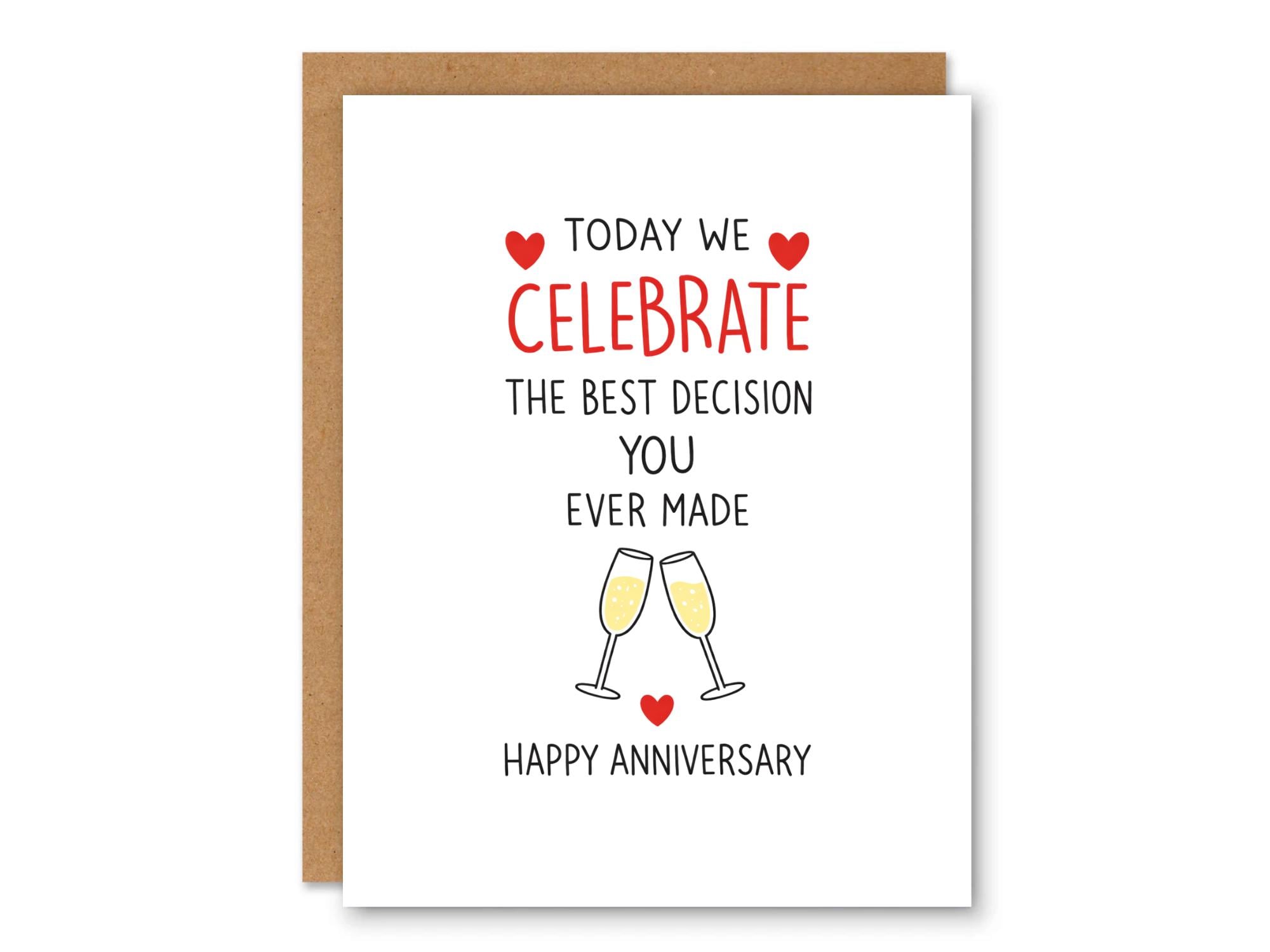 This funny yet heartfelt anniversary card features playful typography, sweet red hearts, and clinking champagne glasses — perfect for couples who appreciate humor with a lot of love behind it.