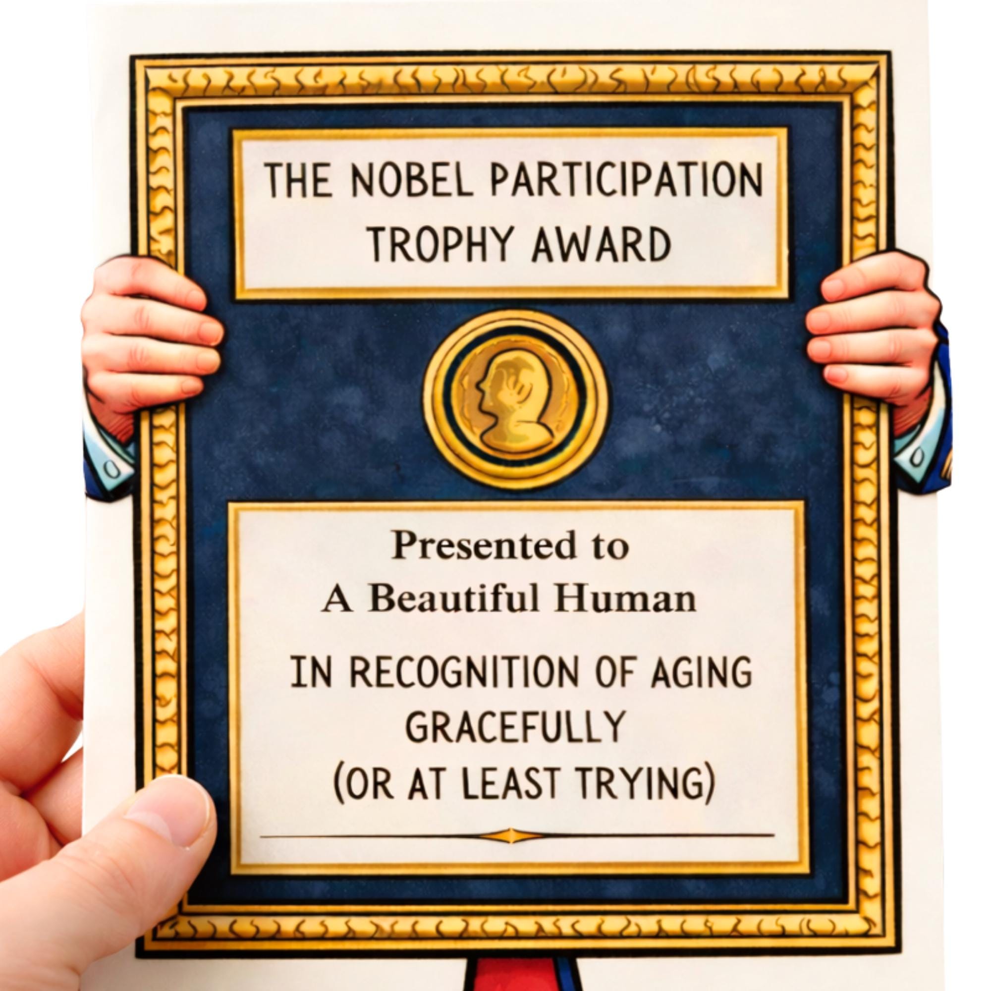 This funny award-style birthday card features a classic “Nobel Participation Trophy” design honoring someone for aging gracefully… or at least trying.
