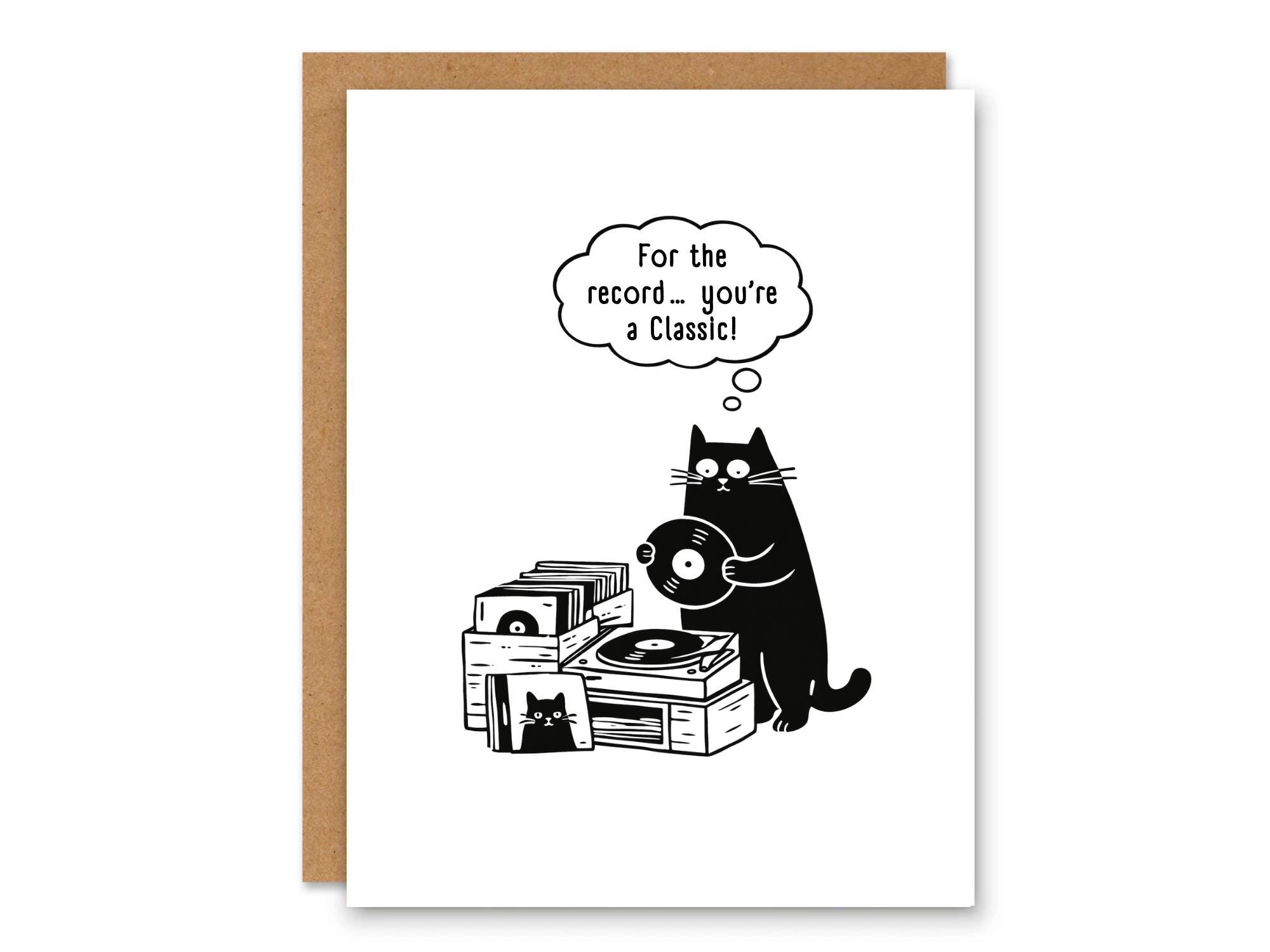A funny, music-lover greeting card made for the guy who collects vinyl and deserves a little extra love (and approval from the cat).