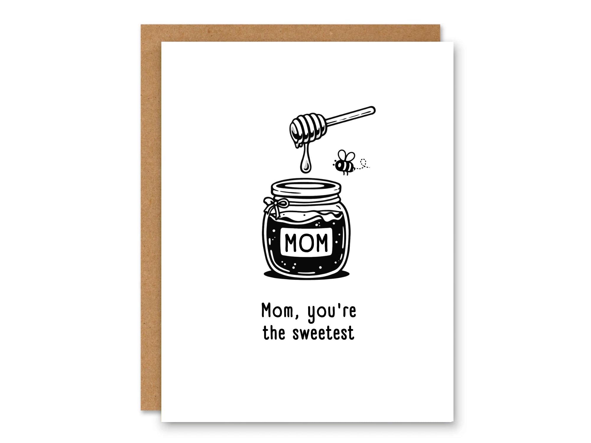This charming illustrated greeting card features a cozy honey jar labeled “MOM,” a dripping honey dipper, and a tiny buzzing bee — paired with the heartfelt message: